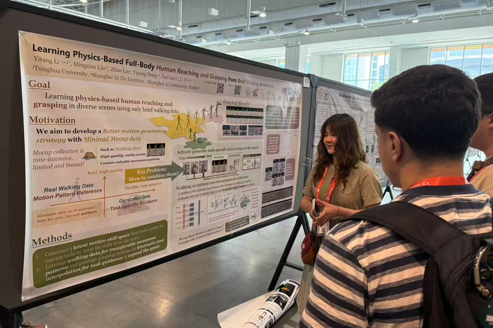 李忆唐敏锐地意识到,破题的关键在于跳出对“真实数据”的绝对依赖,将“灵活的生成数据”与“有限的真实数据”相结合。于是,她进行模型设计,从数据里面找到通用的动作规律,最终实验证明仅用一小段真实数据作为参考,就能生成数字人自然的抓取动作。作为第一作者,她的这项工作被计算机视觉领域顶会CVPR 2025接收。