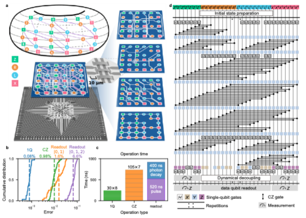 图1:昆仑量子处理器架构图以及双变量自行车码的非局域稳定子提取线路