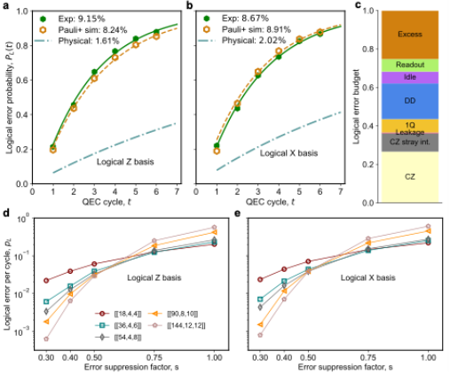 基于“昆仑”量子处理器,团队自主设计并在实验上演示了两种双变量自行车码:[[18,4,4]] 码和 [[18,6,3]] 码。前者利用18个数据比特编码4个距离为4的逻辑比特,后者编码了6个距离为3的逻辑比特。通过执行高效的非局域稳定子提取线路,团队成功演示了多轮量子纠错。实验结果表明,[[18,4,4]] 码和 [[18,6,3]] 码的平均逻辑错误率(按每轮、每逻辑比特统计)分别为8.91% 和 7.77%。此外,数值模拟预测,在所采用的噪声模型与解码设定下,若能将当前芯片的物理操作错误率降低至现有水平的一半,则可跨越双变量自行车码的纠错阈值,为未来突破盈亏平衡点奠定了基础。该工作在审稿阶段获得了同行专家的高度评价, 称其为“迈向容错且低开销量子计算重要而充满原创性的一步”。