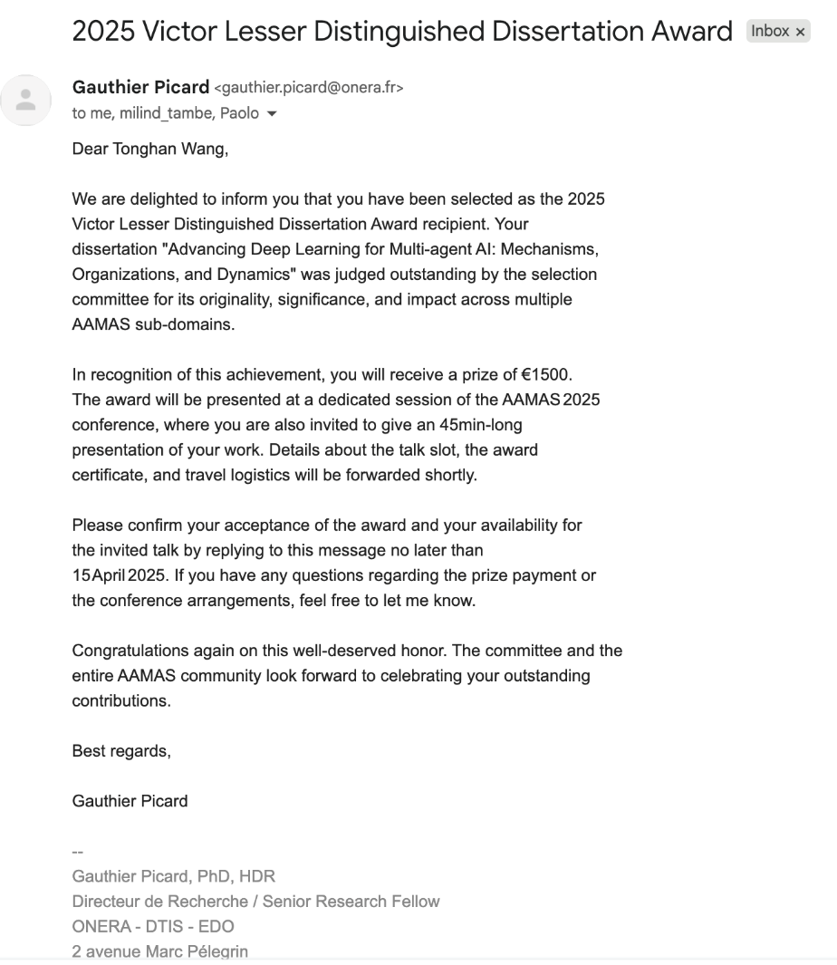 2021届研究生校友、清华大学人工智能学院拟入职助理教授王同翰,荣获“Victor Lesser杰出博士论文奖(Victor Lesser Distinguished Dissertation Award)”。该奖项是智能体和多智能体系统领域给予博士毕业生的全球最高荣誉,被视为顶级学术人才的“风向标”,每年仅在全球范围内评选出极少数(通常为 1 名正式获奖者)在博士阶段对该领域作出卓越贡献的研究者。